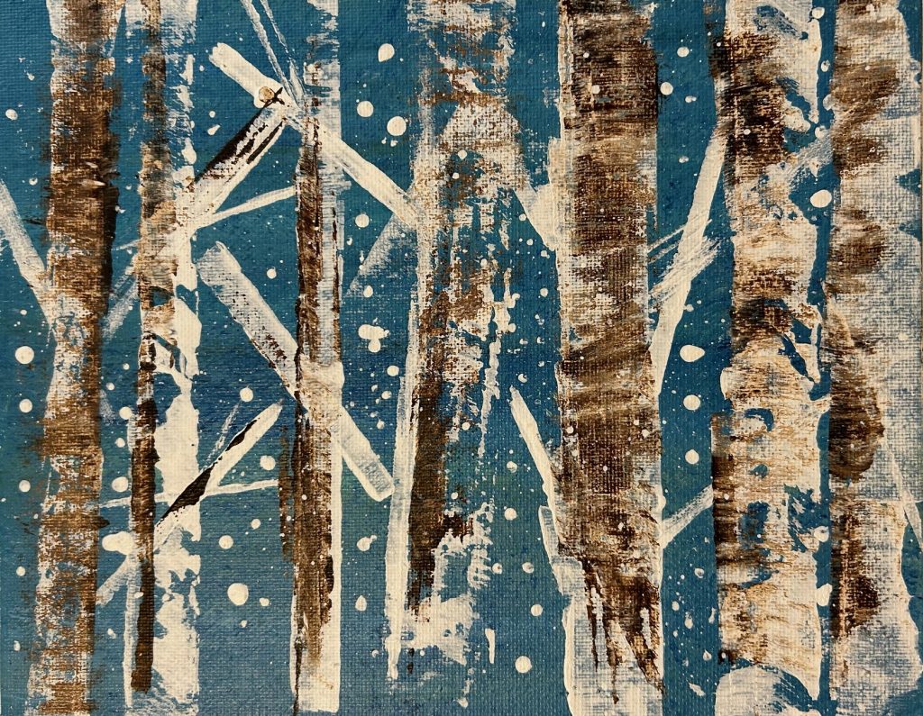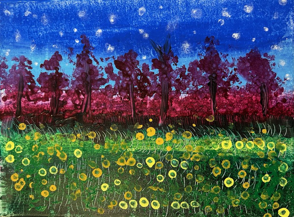 Scott Mikelson is a Port Townsend–based artist who approaches his work with joy, curiosity, and a deep love of nature. He began developing his artistic practice at the Gathering Place, where he discovered painting, ceramics, and watercolor, with a particular passion for landscapes. His paintings bring scenes to life with warmth and humor.